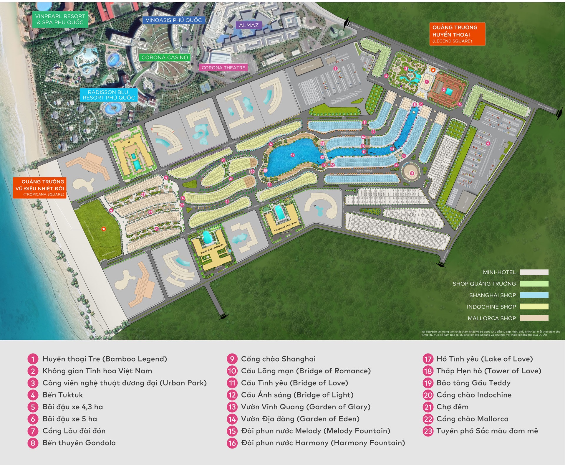 Các căn shop tại đây mang phong cách thiết kế lấy cảm hứng từ Trung Hoa cổ kính, huyền ảo với đèn lồng, các hoạt động ca múa nhạc cổ điển, đồng thời được quy hoạch để kinh doanh ẩm thực, đồ lưu niệm,…